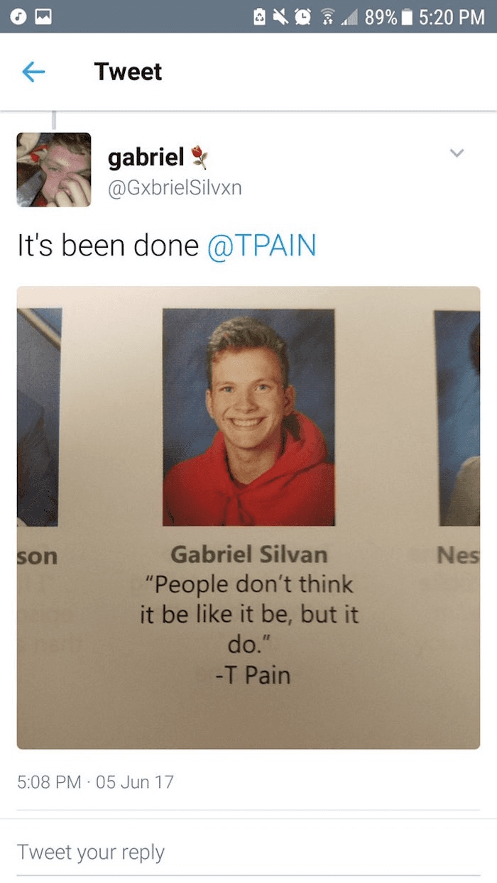 @tpain give me a senior quote please:) — gabriel⚘ (@gxbrielsilvxn) december 15, 2016 “people don't think it be like it be, but it do.” “people don’t think it be like it be, but it do.” “one person’s craziness is another person’s reality.”.